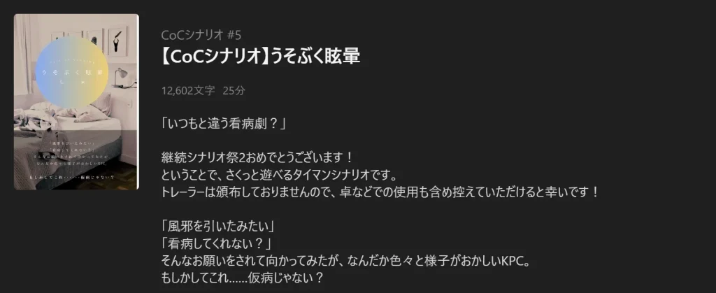・本シナリオはKPCとPCが既知の関係である事を想定として書かれていますが、初めまして同士でも別の楽しみ方ができるかと思います。(見ず知らずのKPCに『なぜか』手厚く看病されるホラーシナリオを味わえます。)