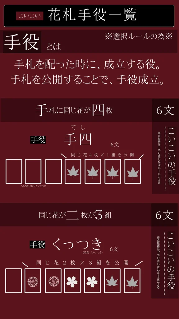 手四・くっつきとは?こいこいの配り直し/6点終了ルールをやさしく整理 こいこいの「手四」「くっつき」は配った時点で成立する例外ルール。成立条件、点数(6点扱いが多い)、配り直しとの違い、ローカル差までまとめて解説します。 - 初心者はまず何の役を覚えるべき?
