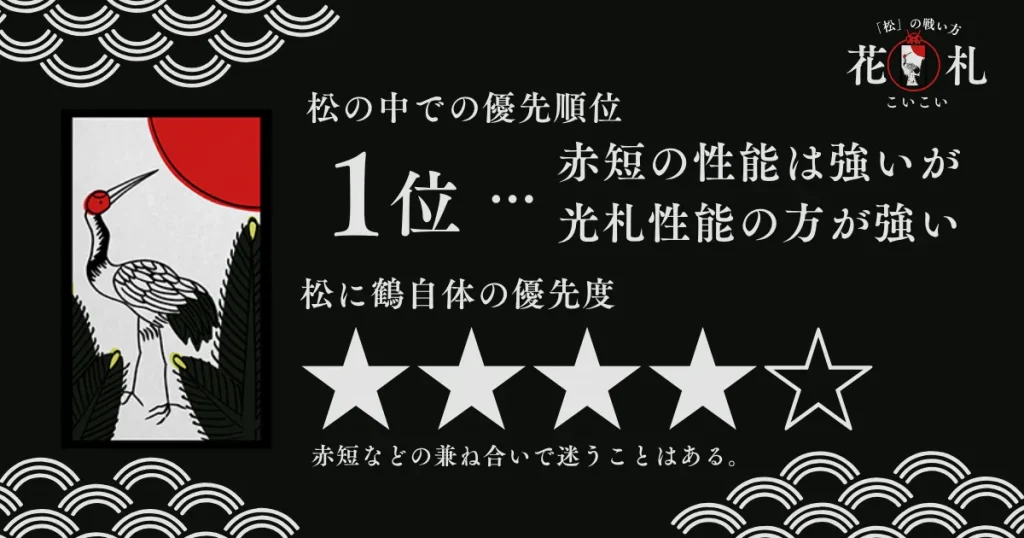 場によっては、松に鶴を先に取るより、松の赤短を押さえた方がその後の役が伸びやすいこともあります。