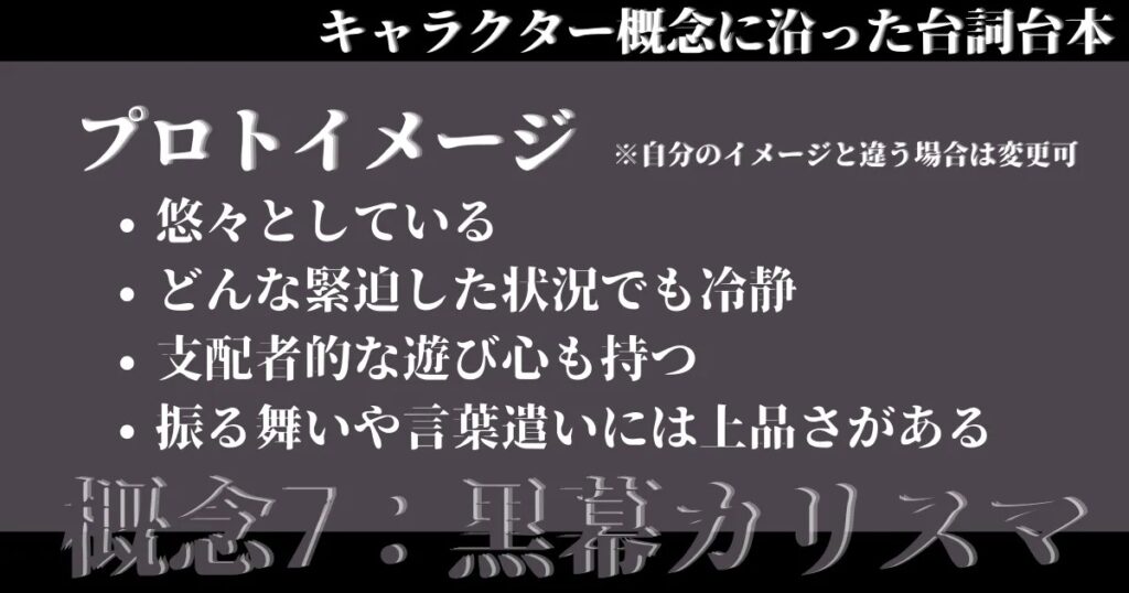 一人用フリー台本10分以内:概念×台本:概念Vol. 7 黒幕カリスマ(性別変更可):練習用にも可。嫌悪感から恋愛までの台本を一つのキャラクター概念のセリフで。設定、男性でも女性でも可、CVあなたの作品、展開の改変は自由