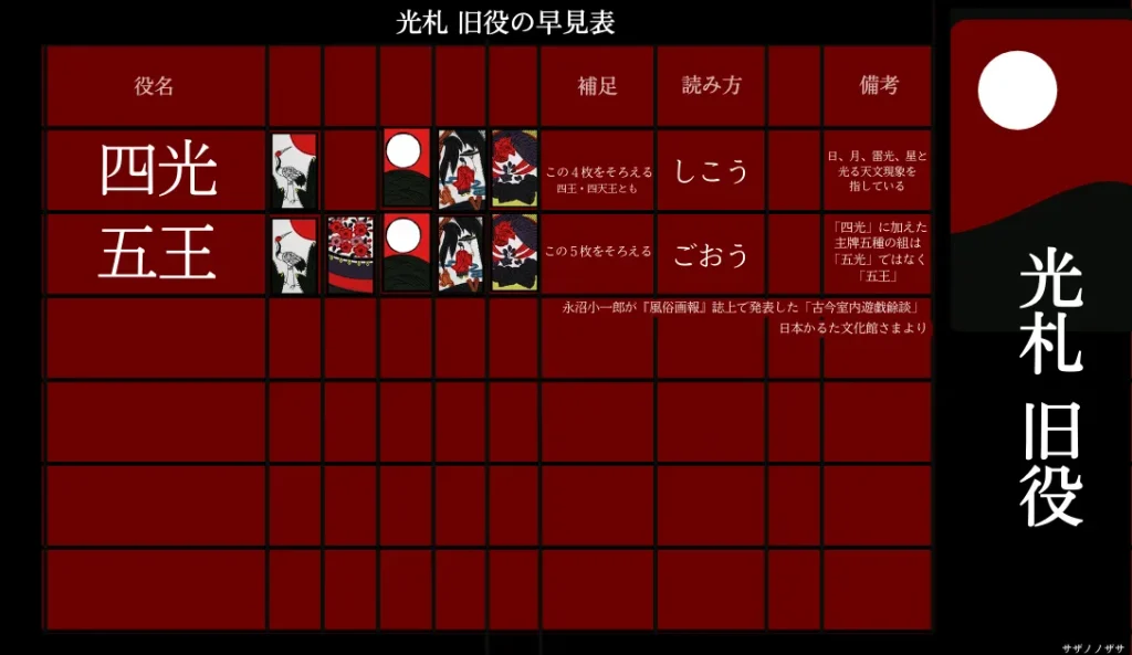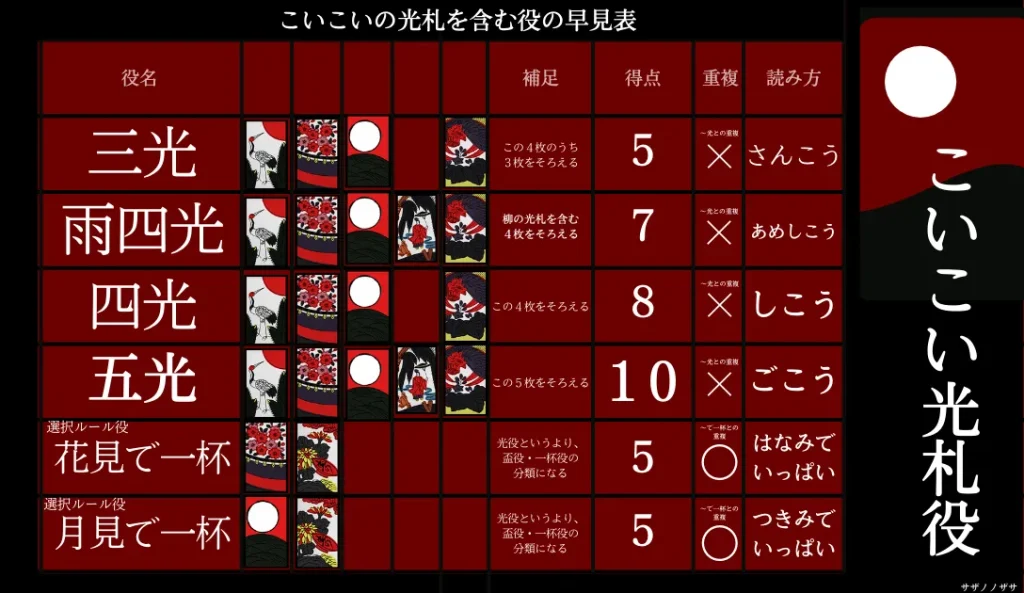 ・三光(さんこう):光札を3枚(※柳の光を含めない扱いが多い)/目安 5文
