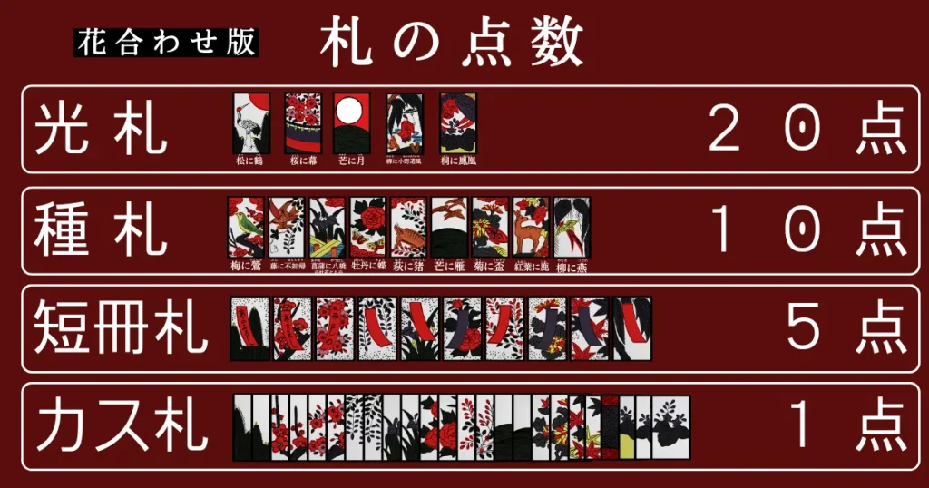 光札…20点、タネ札…10点、短冊札…5点、カス札1点として