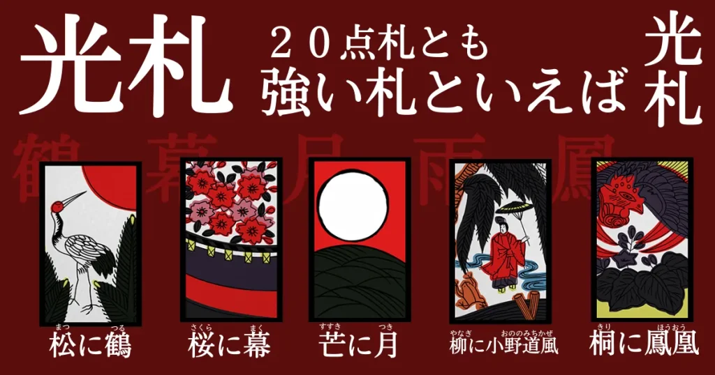 ※梅に鶯も場合によっては光札になりますし、桜に幕は旧式では”光”札ではないらしいです※