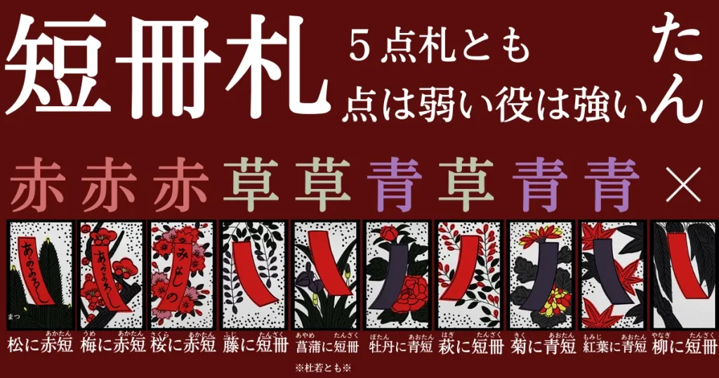 松に赤短冊、梅に赤短冊、桜に赤短冊、藤に短冊、菖蒲に短冊、牡丹に青短冊、萩に短冊、菊に青短冊、紅葉に青短冊、柳に短冊
