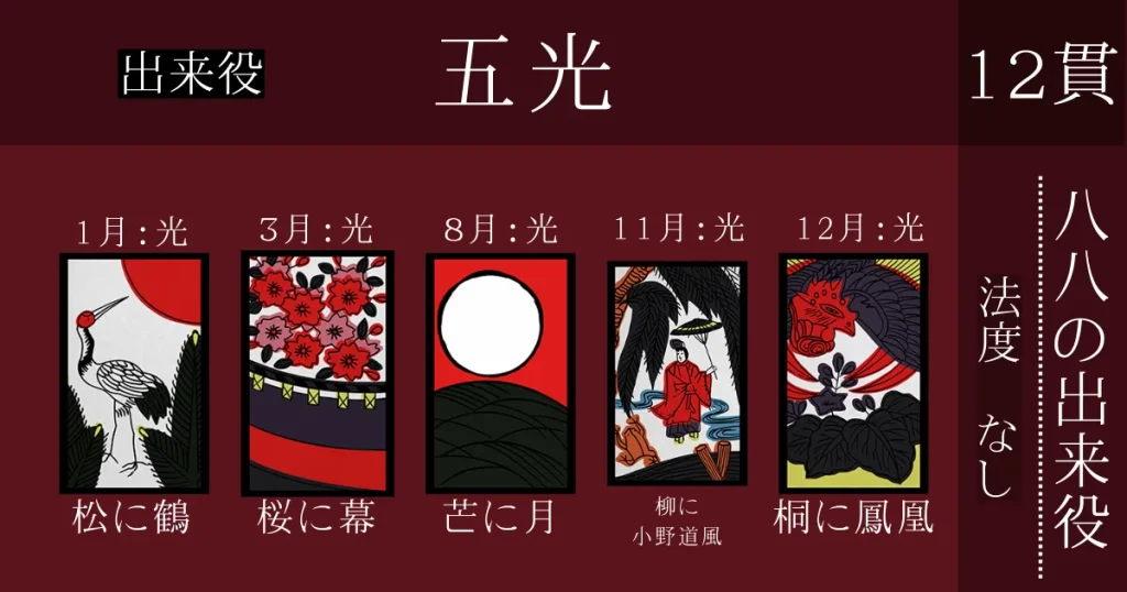 | 五光 | 12貫 | 松に鶴、桜に幕、芒に月、柳に小野道風、桐に鳳凰 | ![]() |