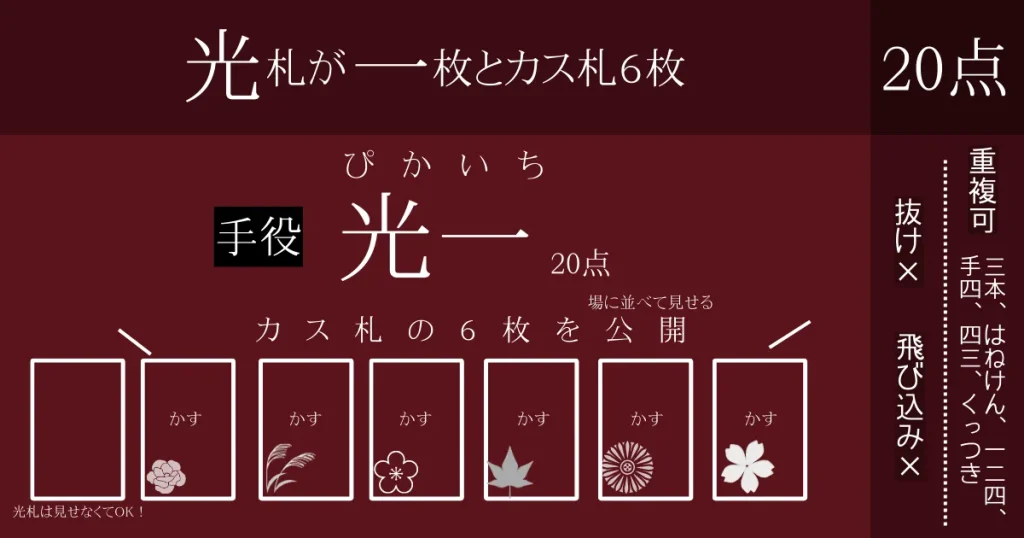 | 光一(ぴかいち) | 20点 | 光札1枚とカス6枚 | ![]() |