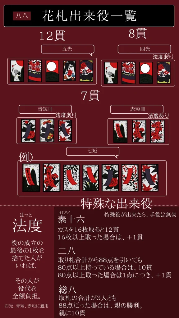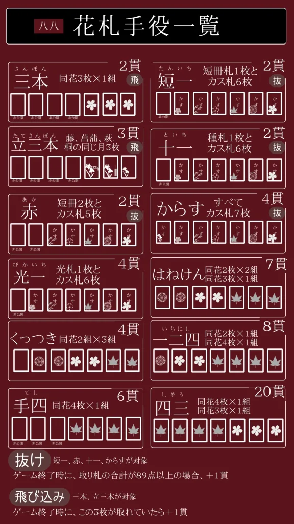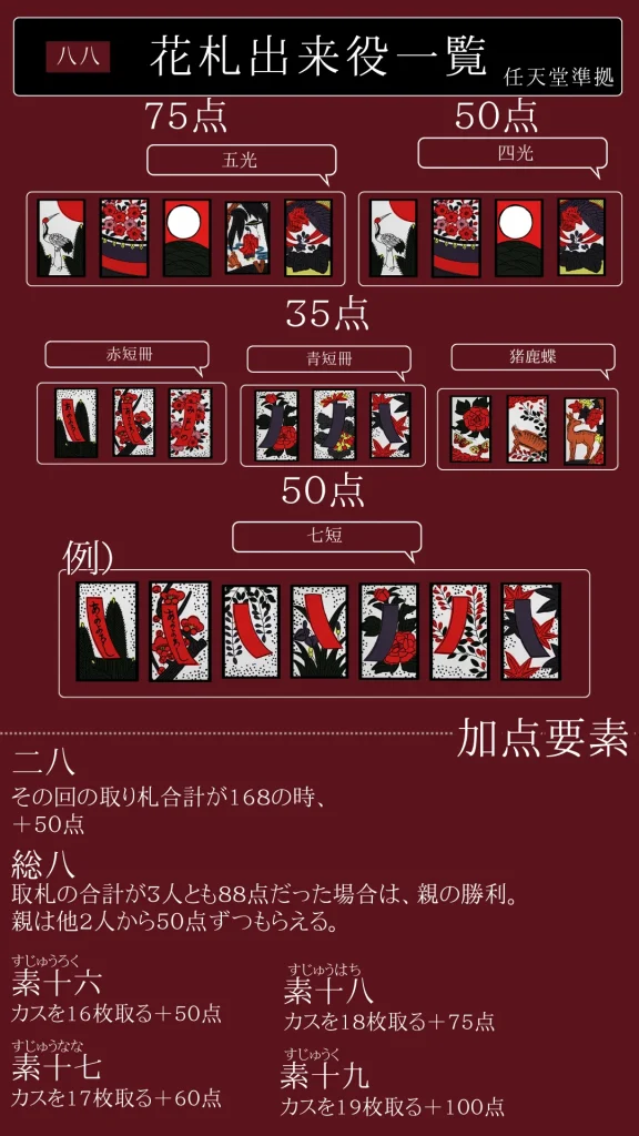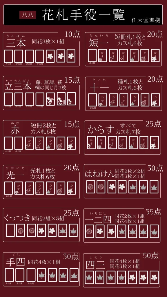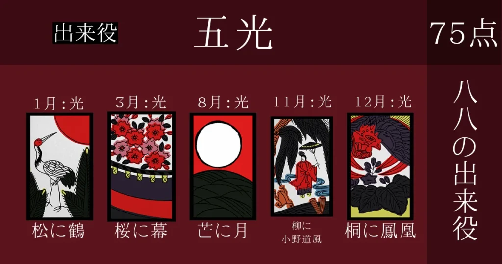 | 五光 | 75点 | 松に鶴、桜に幕、芒に月、柳に小野道風、桐に鳳凰 | ![]() |