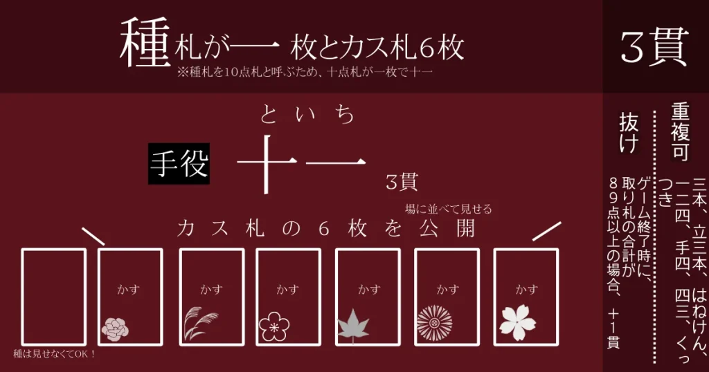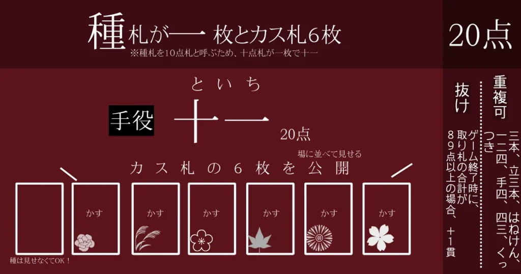 | 十一(といち) | 20点 | 種札1枚とカス札6枚 | ![]() |