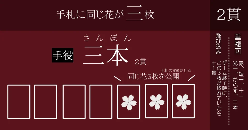 | 三本(さんぼん) | 2貫 | 手札に同じ花が3枚 | ![]() |