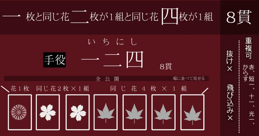 | 一二四(いちにし) | 8貫 | 同じ花1枚×1組 同じ花2枚×1組 同じ花4枚×1組 | ![]() |