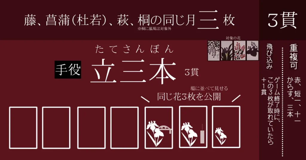 | 立三本(たてさんぼん) | 3貫 | 藤、菖蒲(杜若)、萩、桐の同じ花が3枚 ※桐に鳳凰は除外※ | ![]() |