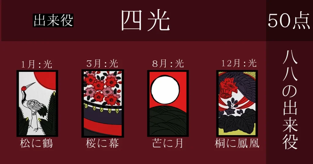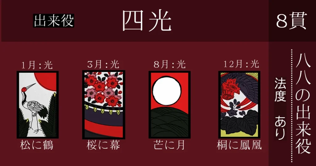 | 四光 | 8貫 | 松に鶴、桜に幕、芒に月、桐に鳳凰 | ![]() |