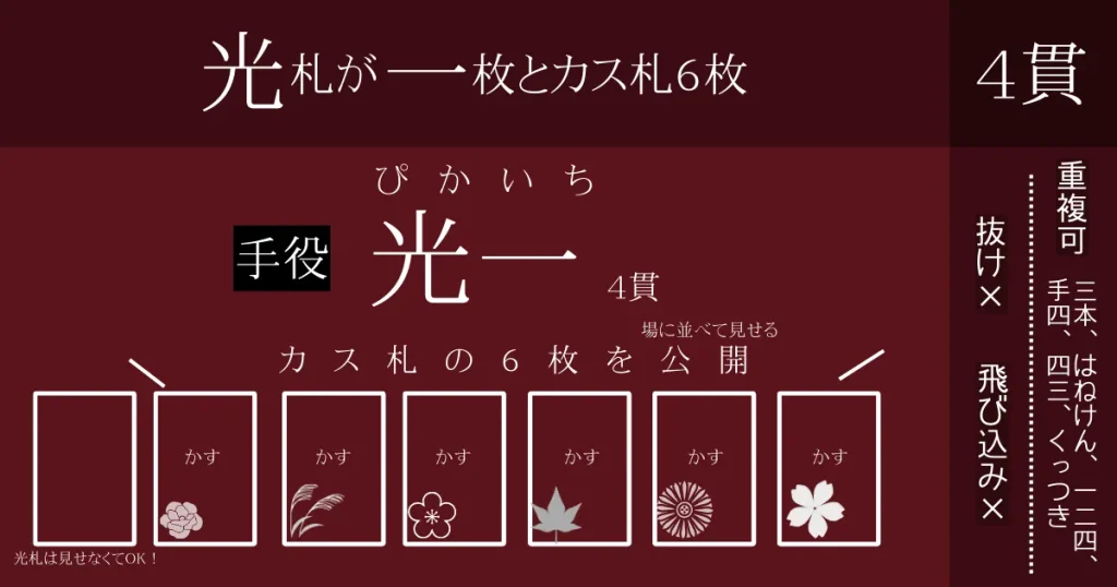 | 光一(ぴかいち) | 4貫 | 光札1枚とカス6枚 | ![]() |