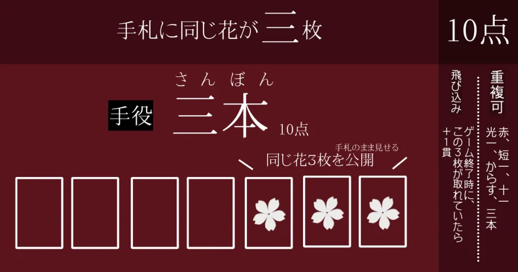 | 三本(さんぼん) | 10点 | 手札に同じ花が3枚 | ![]() |