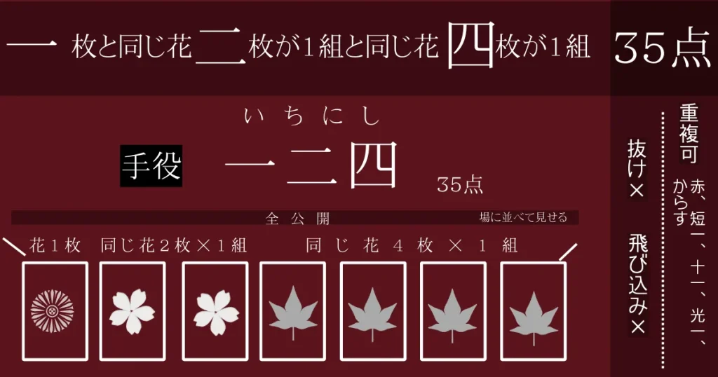 | 一二四(いちにし) | 35点 | 同じ花1枚×1組 同じ花2枚×1組 同じ花4枚×1組 | ![]() |