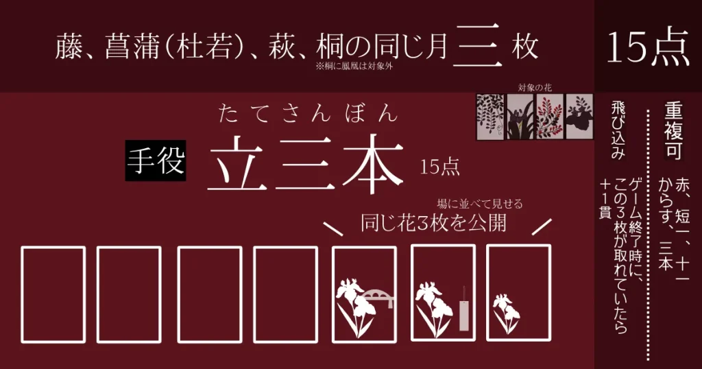 | 立三本(たてさんぼん) | 15点 | 藤、菖蒲(杜若)、萩、桐の同じ花が3枚 ※桐に鳳凰は除外※ | ![]() |