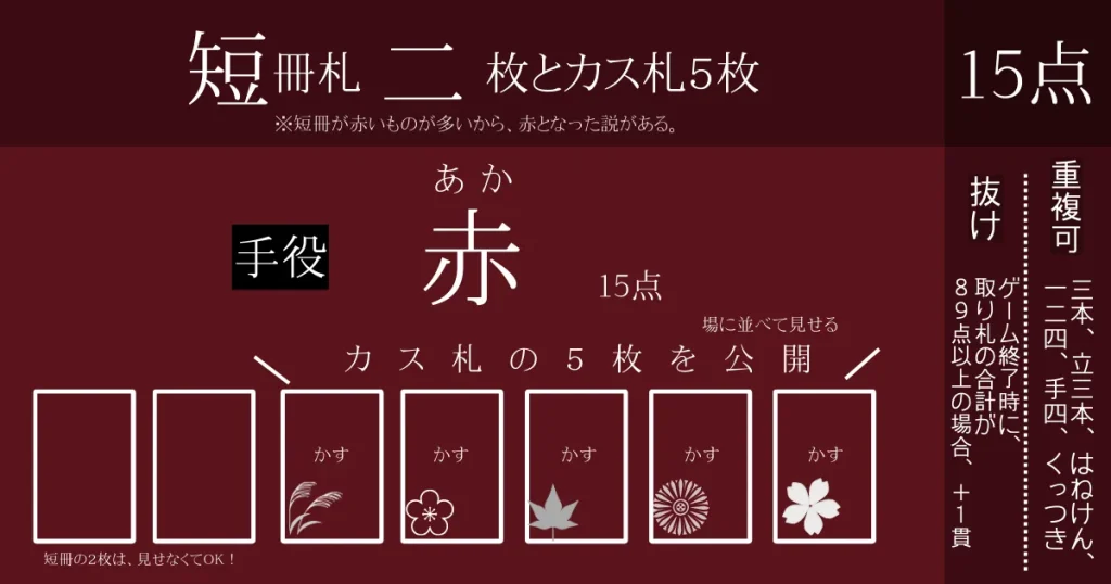| 赤(あか) | 15点 | 短冊札2枚とカス札5枚 | ![]() |