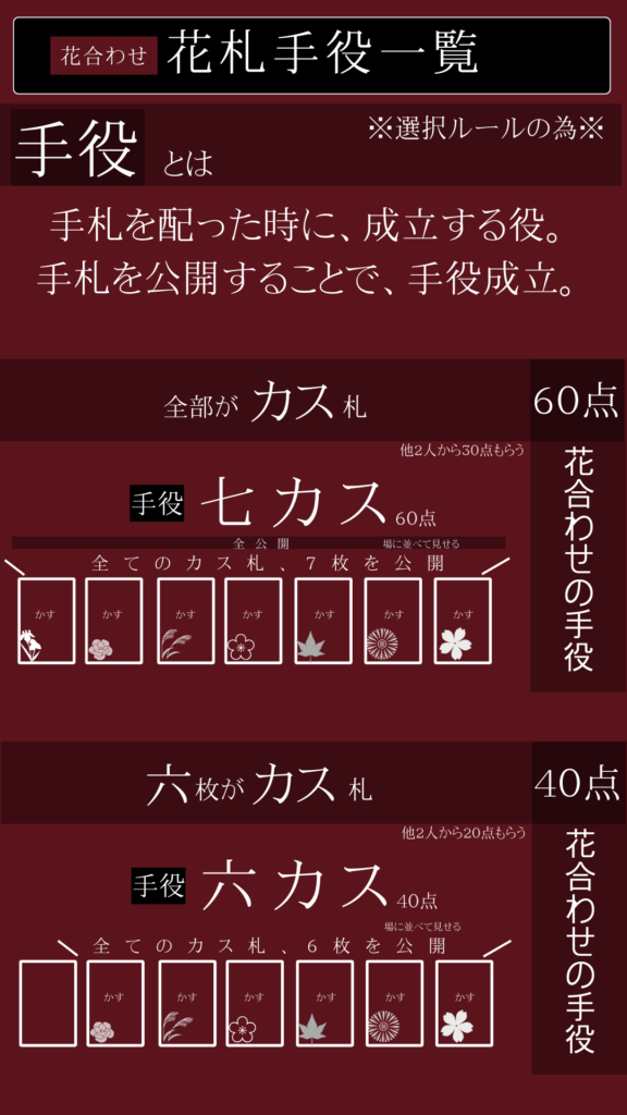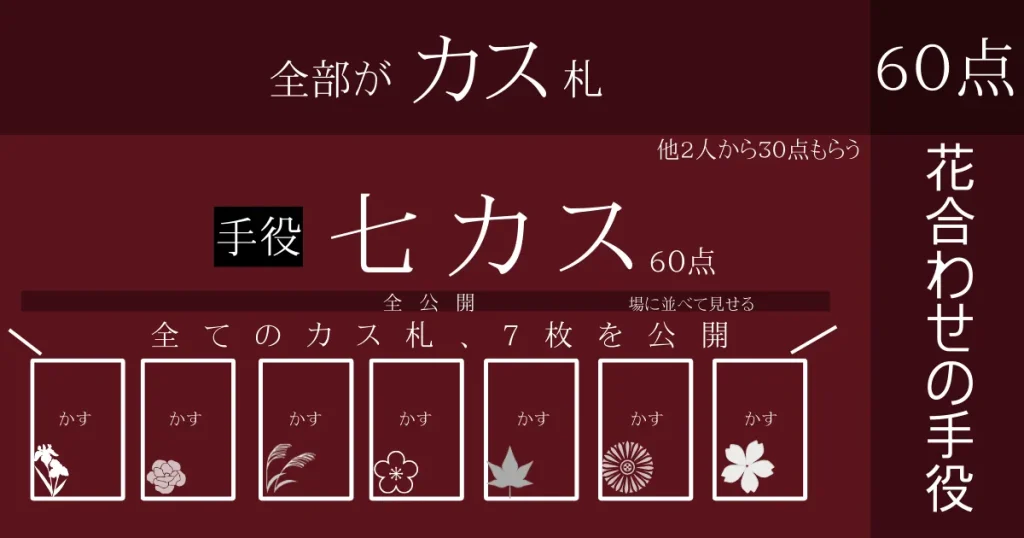 七カス:自分の手札全てがカスだった場合、その手札を公開すると成立。
