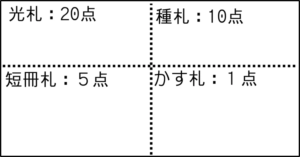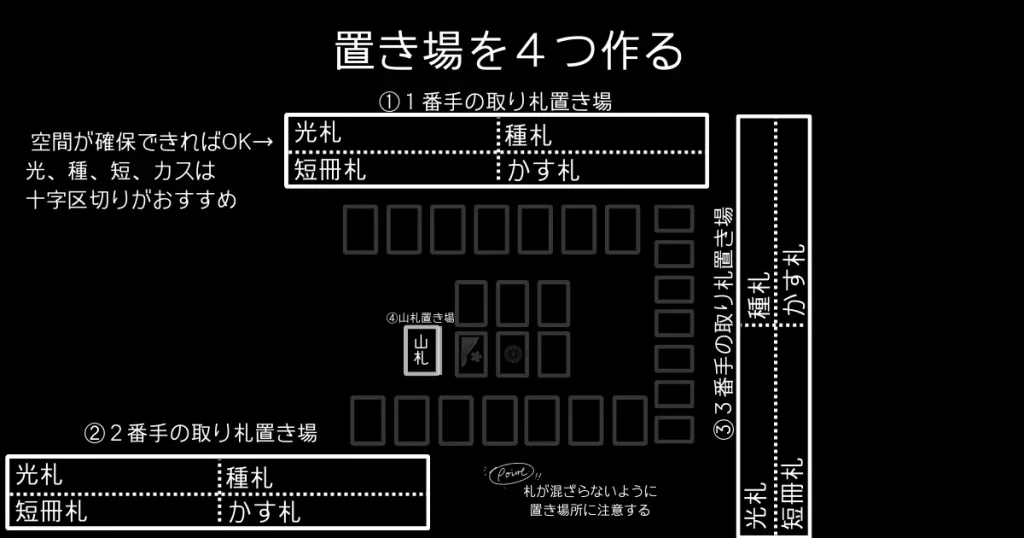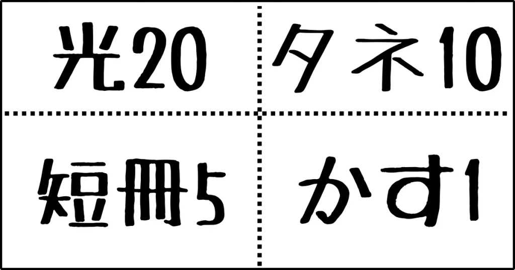 一番上から、光札、種札、短冊札、かす札と並べると分かりやすい。