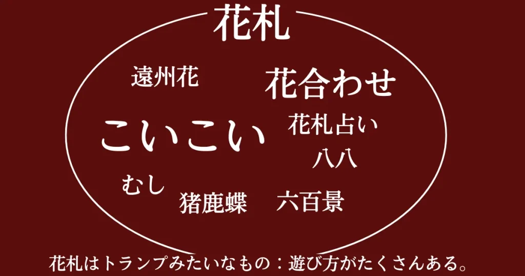 いまは会話上「花札=48枚の札一式」を指すことも多いので、この記事では「花札(48枚の札)」と「遊び方(こいこい/花合わせ/八々など)」を分けて説明しています。