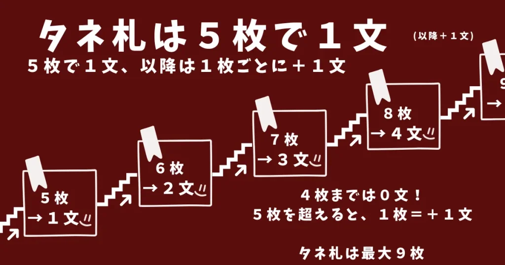 こいこいでは、多くのルール解説で「タネ札を5枚集めると1文、そこから1枚増えるごとに+1文」という階段式になっています。