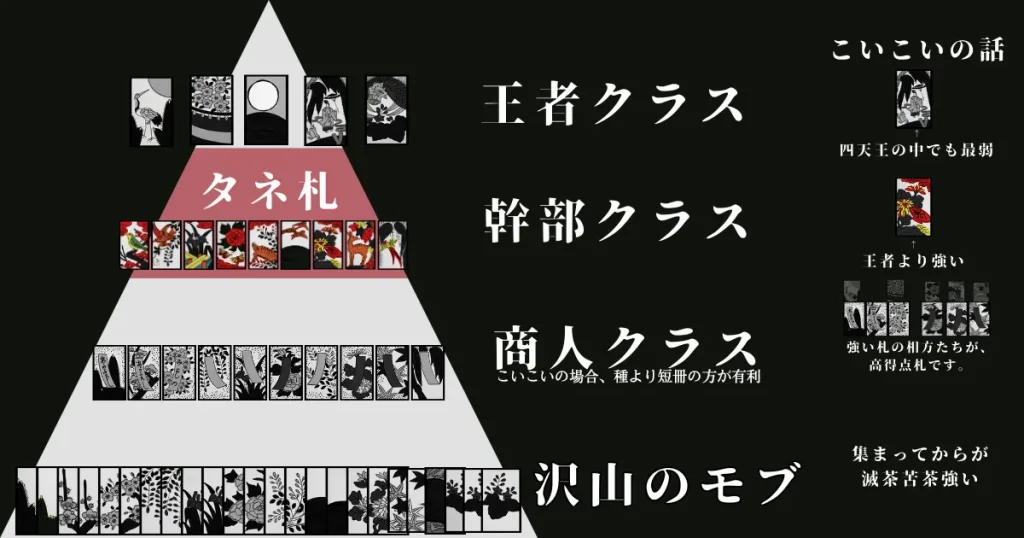 タネは“爆発すると強い”(猪鹿蝶+タネ加点で一気に伸びる)けど、短冊ほど毎試合同じ形で狙いやすいわけではない——という位置づけになります。
