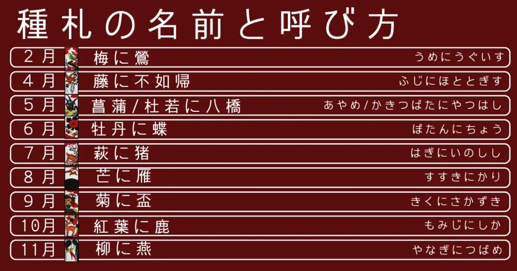 【花札 タネ札 一覧】タネ札は9枚(どの月?どの絵?)