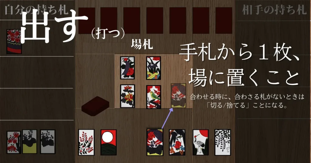 「手札から1枚出す→同じ月があれば取る→山札を1枚めくる→同じ月があれば取る→役ができたら勝負かこいこい」を繰り返すだけです。