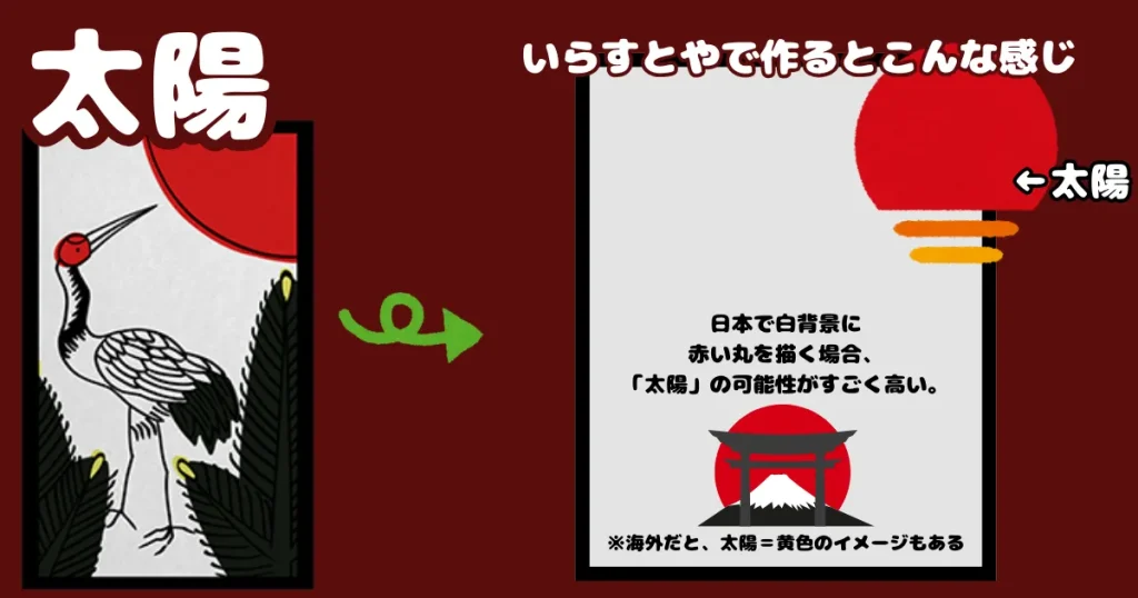 だから花札の赤い丸(旭日)は、単なる背景ではなく、年明けの瑞々しさ=正月の空気を一瞬で伝える記号、とまとめると伝わりやすいです。