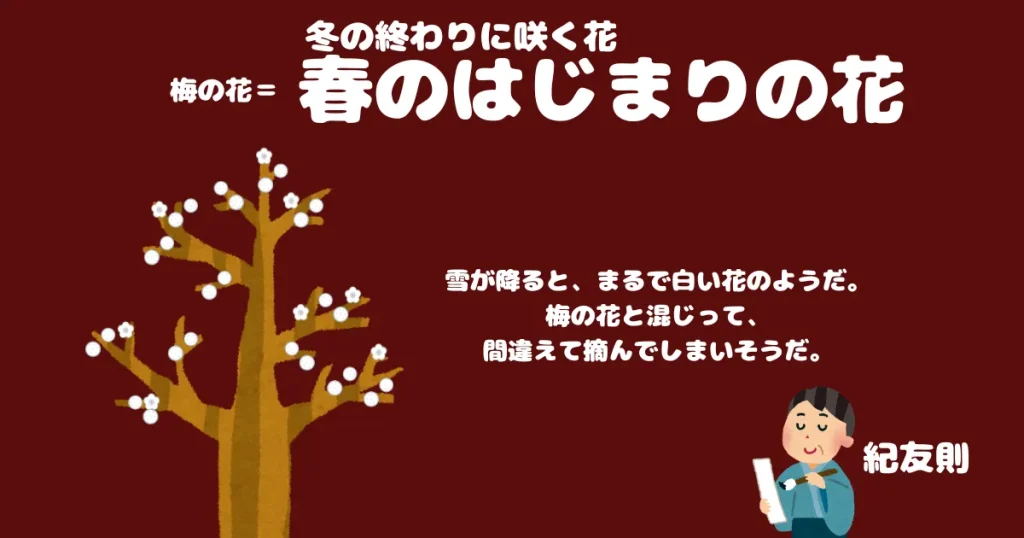 さて、その中でどれを梅と見分けて折ろうか──という歌。古今和歌集の冬歌として伝わります。