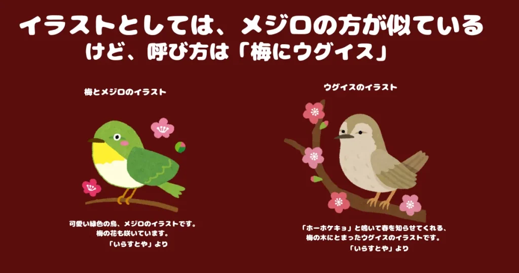 一方で、実際の梅に来る鳥として目白が話題になりやすいこと、また絵画表現の“鶯の描かれ方”には誤りが起きやすい点も指摘されています(諸説)