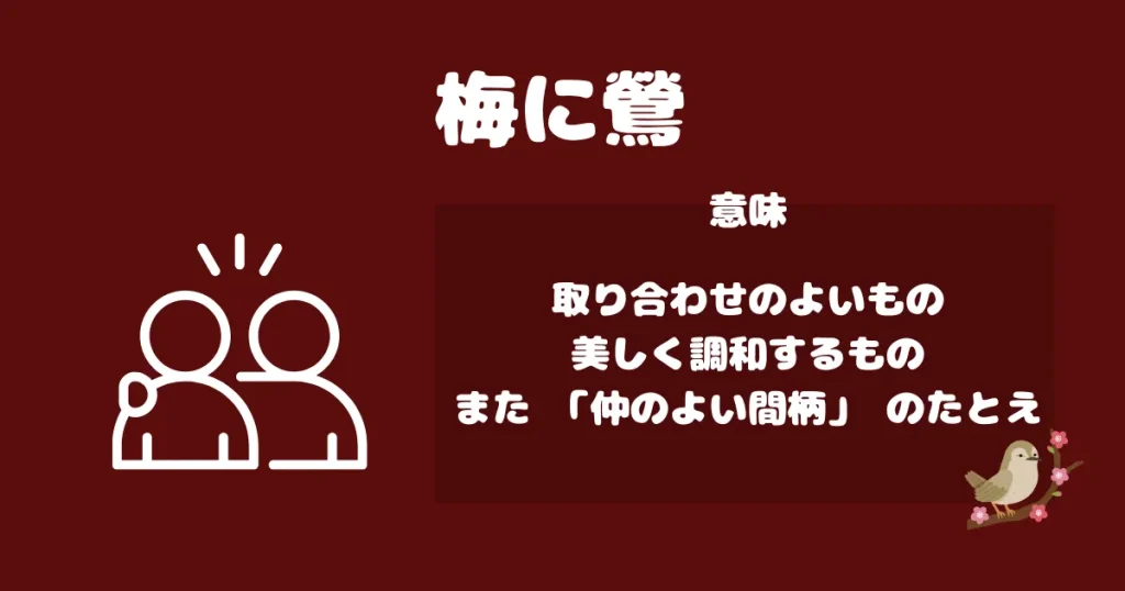 「梅に鶯」は取り合わせの良い二つのもの/仲の良い二人の間柄を意味することわざだと紹介されています。