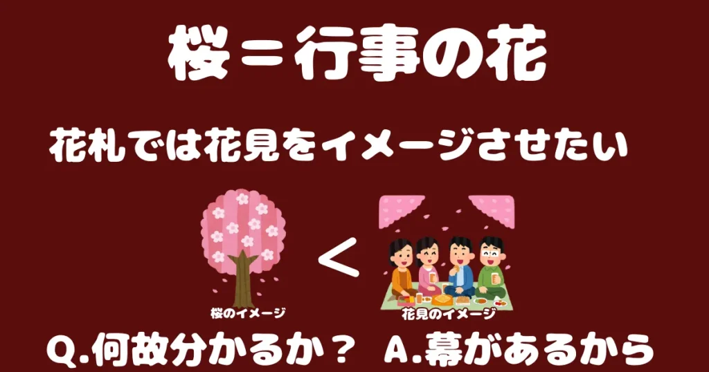 花札の「桜に幕」は、その”春になってイベントが盛り上がる様子”を絵柄にした札、という読み方ができます。