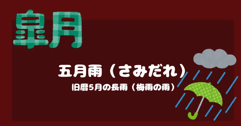 その雨を指す言葉として 「五月雨(さみだれ)=旧暦5月の長雨(梅雨の雨)」が説明されています。