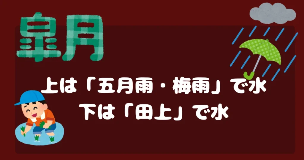 和風月名の説明では、皐月は 早苗(さなえ)を植える月とされます。