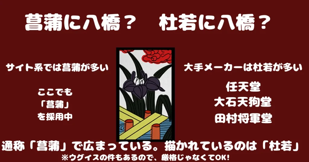 呼び名としては「菖蒲に八橋」が一般的ですが、札元(大石天狗堂)は「杜若に八つ橋」として説明し、水辺の花としての整合などを挙げています。