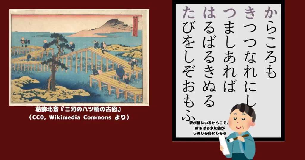 『伊勢物語』の八橋段で詠まれる「からころも…」の和歌で、各句の頭を拾うと「か・き・つ・は・た」=かきつばたになる折り句として紹介されています。