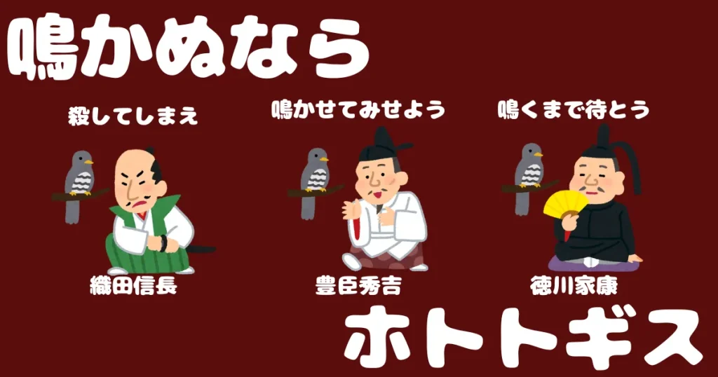 「鳴かぬなら〜ほととぎす」という三英傑(信長・秀吉・家康)の性格たとえ話です。