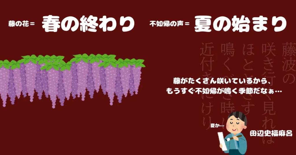 | 現代語訳(趣旨): 藤の花が波のように咲きわたるのを見ると、ほととぎすが鳴く季節が近づいたと感じる。 |