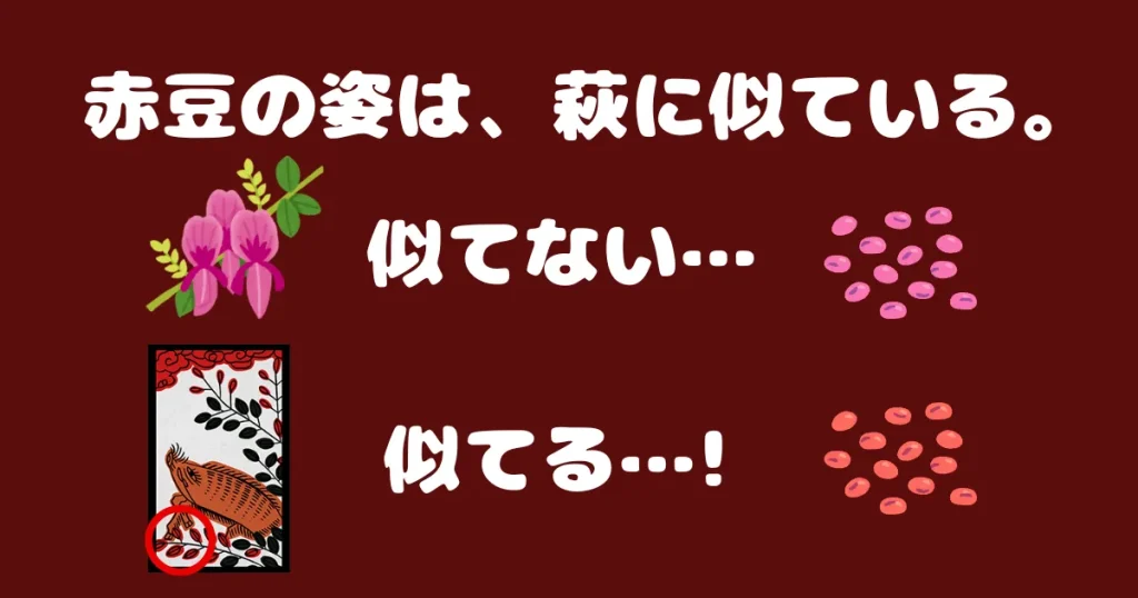 札の上で、花や葉がやや“豆っぽい記号”に寄って見えるのは、写実というより「萩だと読める形」に最適化された結果——そう捉えると「赤豆」にも納得がつきます。