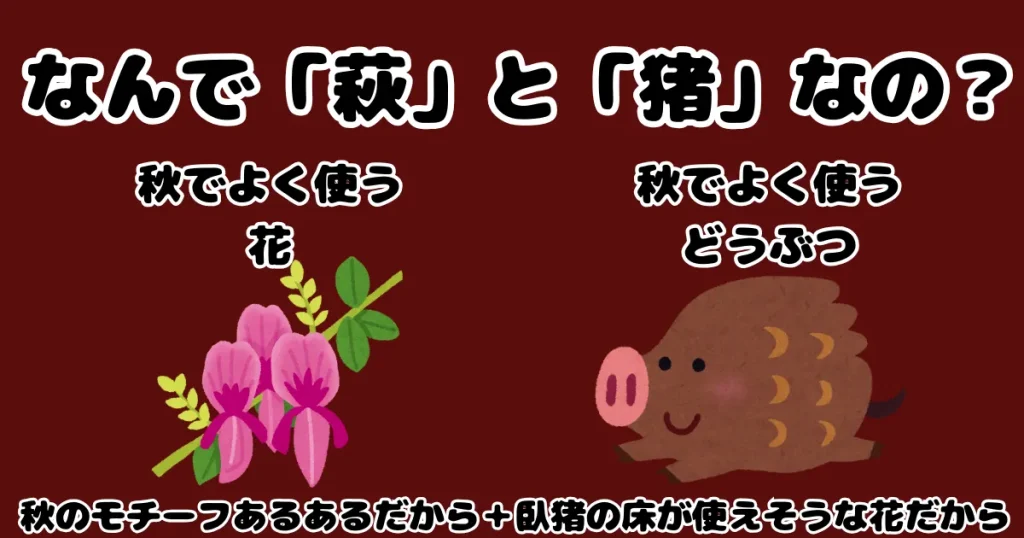 臥猪=伏せて休む猪のこと。萩や萱を倒して寝床にするイメージから、「臥猪の床(ふすいのとこ)」という言い方があり、「萩と猪」がセットで語られる背景にもなっています。