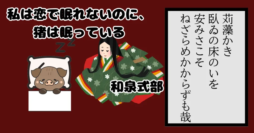 歌の意味は”猪は寝床が心地よくて安眠するらしいのに、私は恋で眠れない”という対比。