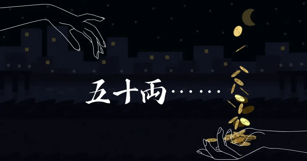 ほぼ無言、台詞は『五十両……』くらい」という理解で置いておけば大丈夫です。