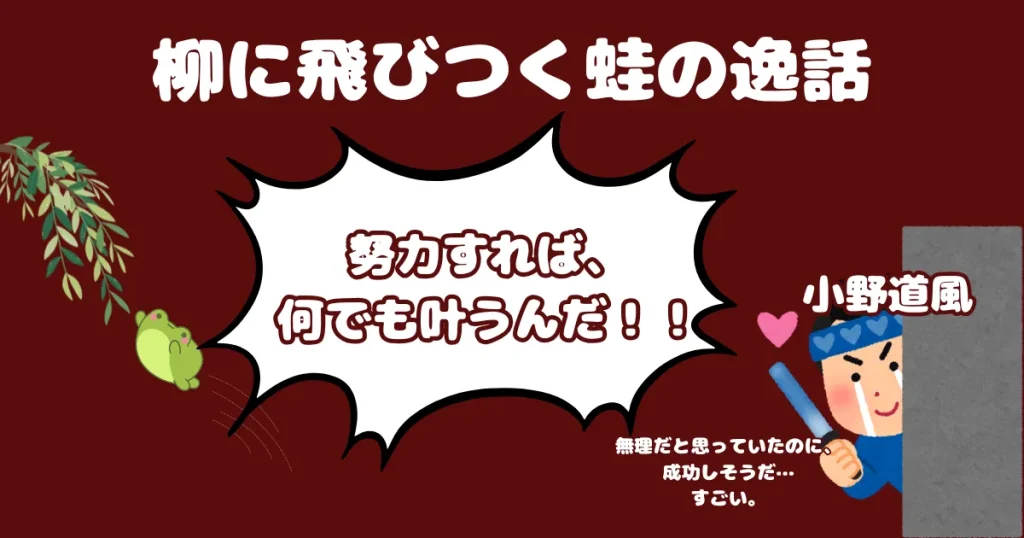 後世の教訓話・芝居・見立てとして広まったものです。史実の道風の性格や人生を直接表すというより、