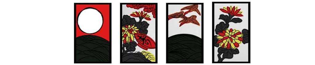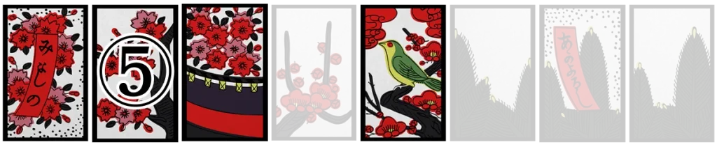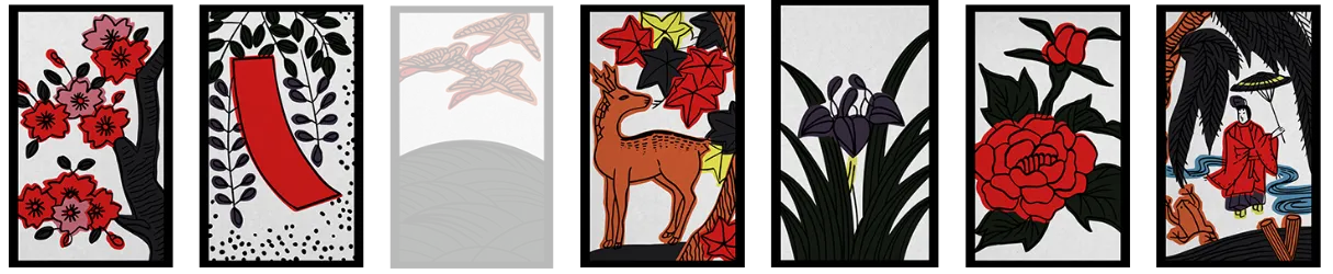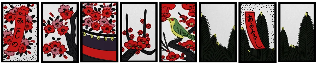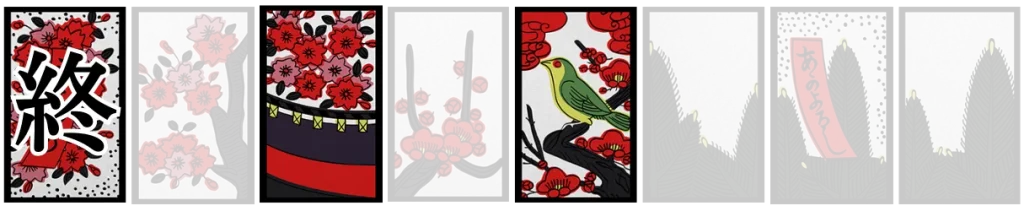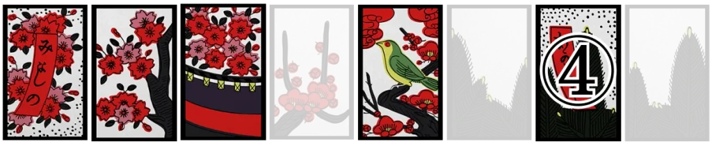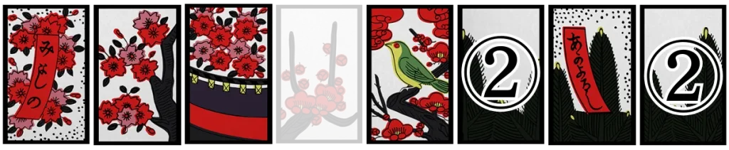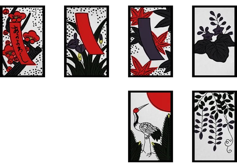 梅に赤短、菖蒲に短冊、紅葉に青短、桐のかす、松に鶴、藤のかす