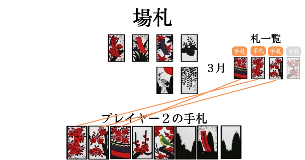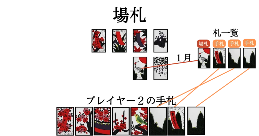 (空いたスペースはプレイヤー1が取った「芒に月」、「菊に盃」)