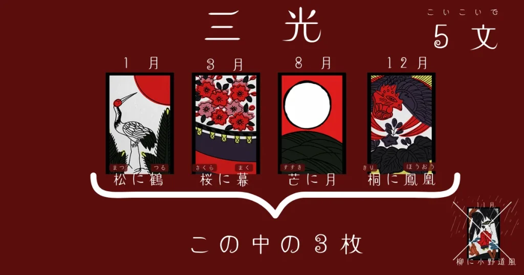 柳に小野道風を除いた4枚の光札のうち、3枚を集めたときに三光になります。