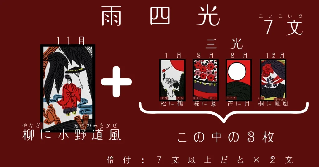 この札が入るかどうかで、三光・四光・雨四光の区別が変わります。