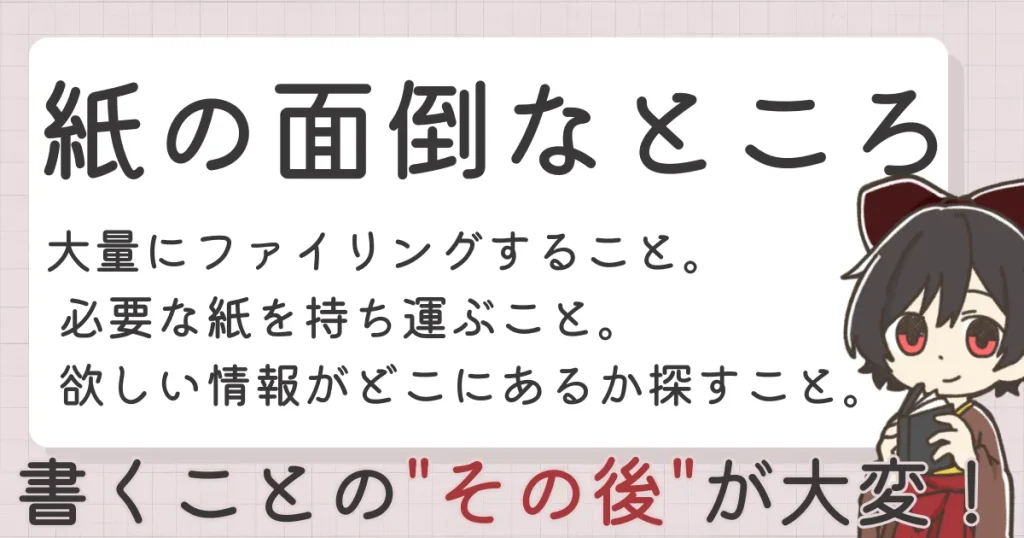 でも実際は、書いたあとにしまう、探す、持っていく、まとめ直す……と、少しずつ仕事が増えていきます。