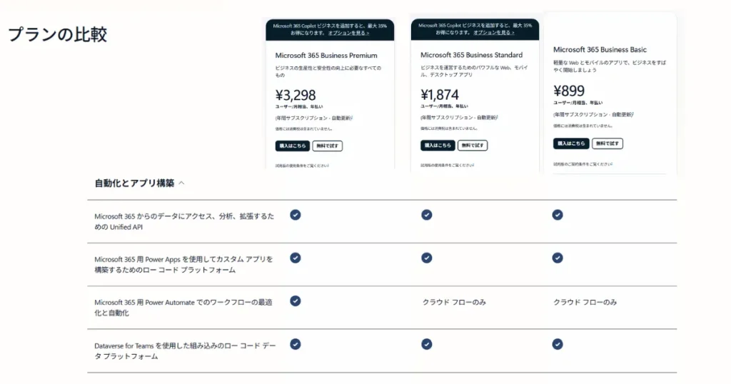 Power Appsを使いたい時は、まず Microsoft 365 Business Basic・Business Standard・Business Premium の3つを見れば大丈夫です。
